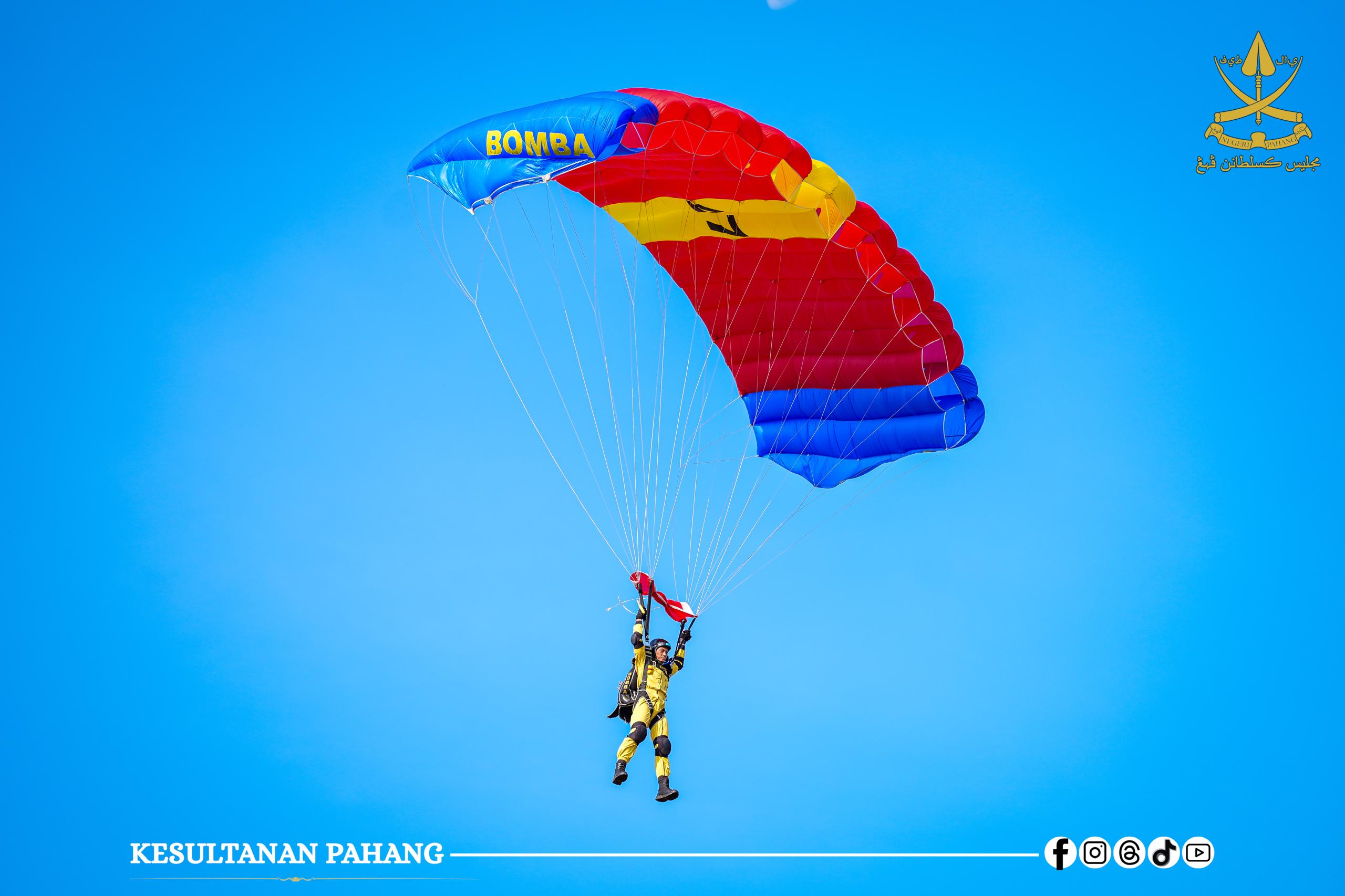 KUANTAN, 8 April 2026 – Kebawah Duli Paduka Baginda Sultan Pahang, Al-Sultan Abdullah Ri’ayatuddin Al-Mustafa Billah Shah Ibni Al-Marhum Sultan Haji Ahmad Shah berkenan bercemar duli berangkat menyaksikan fasa kedua (penerjunan) Kursus Asas Payung Terjun Static Ram Air Siri 1/2026 yang berlangsung di Pangkalan Udara Kuantan, hari ini.