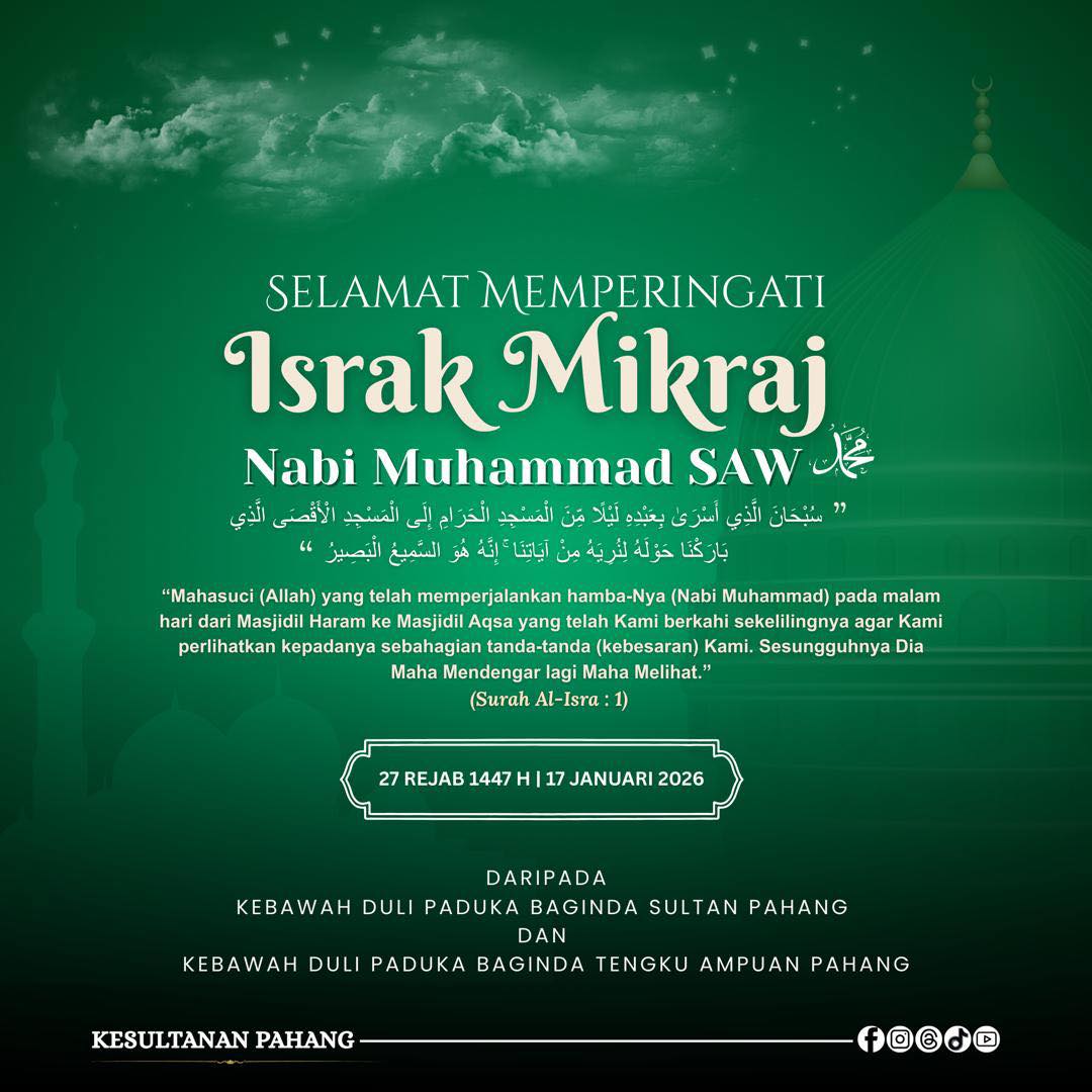 KUANTAN, 17 Januari 2026 – Kebawah Duli Paduka Baginda Sultan Pahang Al-Sultan Abdullah Ri’ayatuddin Al-Mustafa Billah Shah Ibni Al-Marhum Sultan Haji Ahmad Shah dan Kebawah Duli Paduka Baginda Tengku Ampuan Pahang Tunku Azizah Aminah Maimunah Iskandariah Binti Almarhum Sultan Iskandar Al-Haj menyeru seluruh umat Islam khususnya di negeri ini agar memperingati peristiwa Israk dan Mikraj yang jatuh pada Sabtu, 17 Januari 2026 bersamaan 27 Rejab 1447 Hijrah.