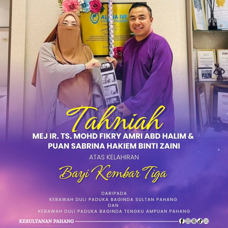 KUANTAN, 25 Oktober 2025 – Kebawah Duli Paduka Baginda Sultan Pahang Al-Sultan Abdullah Ri’ayatuddin Al-Mustafa Billah Shah Ibni Almarhum Sultan Haji Ahmad Shah dan Kebawah Duli Paduka Baginda Tengku Ampuan Pahang Tunku Azizah Aminah Maimunah Iskandariah Binti Almarhum Sultan Iskandar Al-Haj menzahirkan ucapan tahniah di atas kelahiran cahaya mata kembar tiga tajaan Yayasan Fertiliti Tunku Azizah (TAFF) kepada Mejar Ir. Ts Mohd Fikry Amri Abd Halim dan Puan Sabrina Hakiem Zaini.
