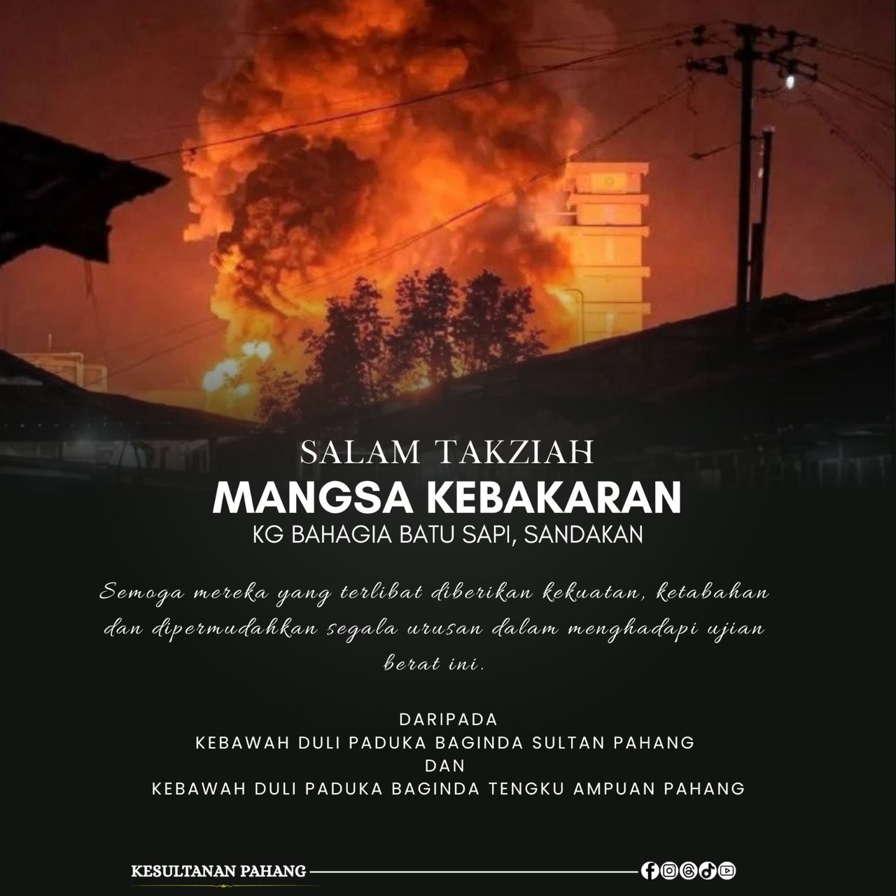 KUANTAN, 20 April 2026 – Kebawah Duli Paduka Baginda Sultan Pahang, Al-Sultan Abdullah Ri’ayatuddin Al-Mustafa Billah Shah Ibni Al-Marhum Sultan Haji Ahmad Shah bersama Kebawah Duli Paduka Baginda Tengku Ampuan Pahang, Tunku Azizah Aminah Maimunah Iskandariah binti Almarhum Sultan Iskandar Al-Haj menzahirkan rasa dukacita dan simpati yang amat mendalam di atas kejadian kebakaran besar di perkampungan atas air Kampung Bahagia, Batu Sapi di Sandakan, Sabah.