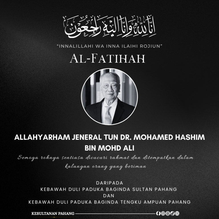 KUANTAN, 28 September 2025 – Kebawah Duli Paduka Baginda Sultan Pahang Al-Sultan Abdullah Ri’ayatuddin Al-Mustafa Billah Shah Ibni Almarhum Sultan Haji Ahmad Shah dan Kebawah Duli Paduka Baginda Tengku Ampuan Pahang Tunku Azizah Aminah Maimunah Iskandariah Binti Almarhum Sultan Iskandar menzahirkan ucapan takziah kepada seluruh ahli keluarga Panglima Angkatan Tentera ke-9, Allahyarham Jeneral Tun Dr. Mohamed Hashim bin Mohd Ali yang meninggal dunia di Hospital Gleaneagles pukul 11.52 pagi , hari ini.