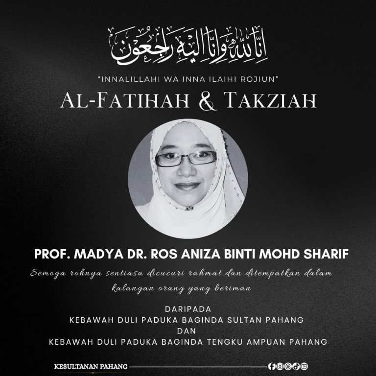 KUANTAN, 5 Ogos 2025 – Kebawah Duli Paduka Baginda Sultan Pahang, Al-Sultan Abdullah Ri’ayatuddin Al-Mustafa Billah Shah Ibni Almarhum Sultan Haji Ahmad Shah dan Kebawah Duli Paduka Baginda Tengku Ampuan Pahang Tunku Azizah Aminah Maimunah Iskandariah Binti Almarhum Sultan Iskandar Al-Haj menzahirkan ucapan takziah kepada keluarga Allahyarham Profesor Madya Dr. Ros Aniza Mohd Shariff.