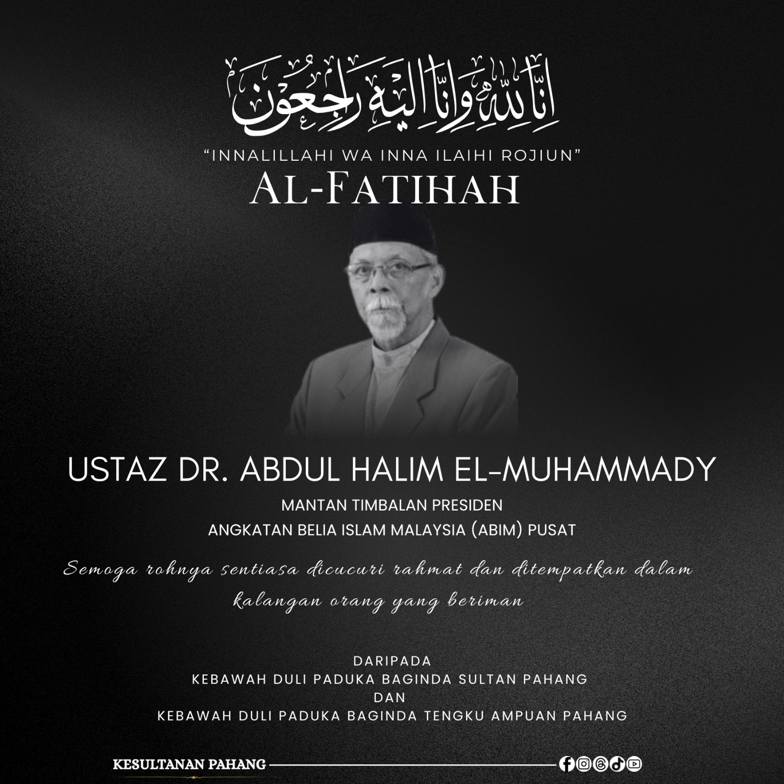 KUANTAN, 16 April 2026 – Kebawah Duli Paduka Baginda Sultan Pahang, Al-Sultan Abdullah Ri’ayatuddin Al-Mustafa Billah Shah Ibni Al-Marhum Sultan Haji Ahmad Shah dan Kebawah Duli Paduka Baginda Tengku Ampuan Pahang Tunku Azizah Aminah Maimunah Iskandariah Binti Almarhum Sultan Iskandar Al-Haj menzahirkan ucapan takziah kepada keluarga