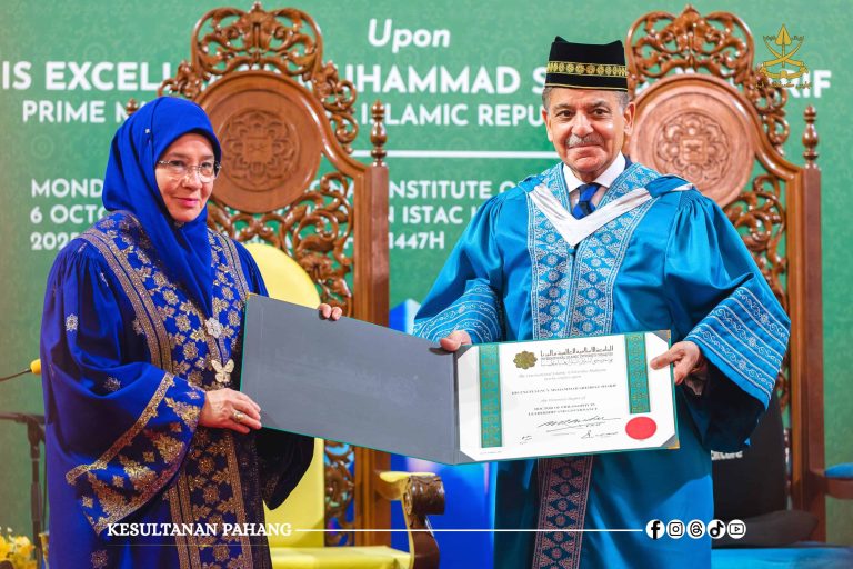 KUALA LUMPUR, 6 Oktober 2025 – Kebawah Duli Paduka Baginda Tengku Ampuan Pahang Tunku Azizah Aminah Maimunah Iskandariah Binti Almarhum Sultan Iskandar Al-Haj berkenan menyempurnakan penganugerahan Ijazah Kehormat Doktor Falsafah (Kepimpinan dan Tadbir Urus) kepada Perdana Menteri Republik Islam Pakistan, Tuan Yang Terutama Muhammad Shehbaz Sharif.