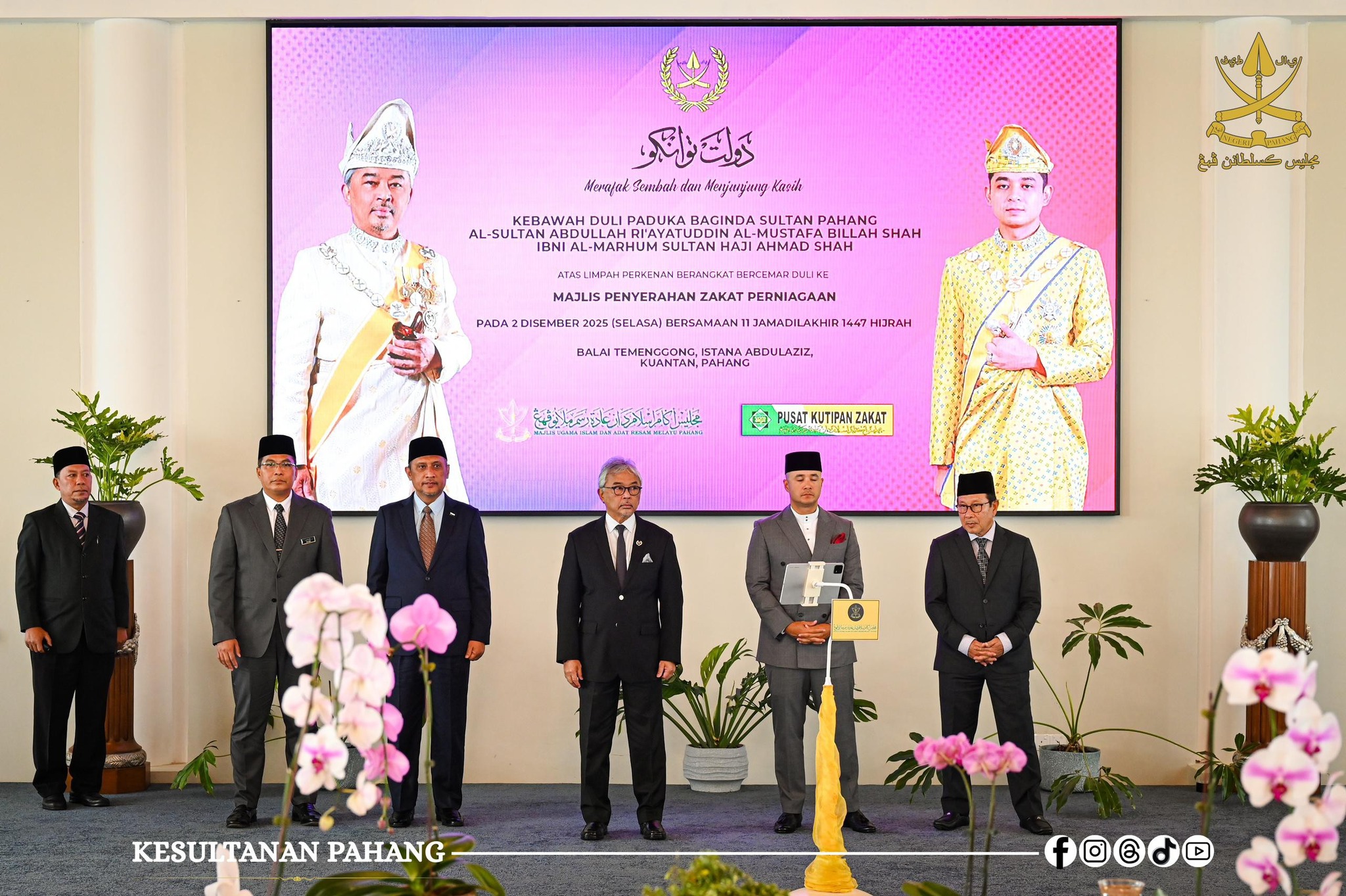 Kebawah Duli Paduka Baginda Sultan Pahang Al-Sultan Abdullah Ri’ayatuddin Al-Mustafa Billah Shah Ibni Almarhum Sultan Haji Ahmad Shah berkenan menerima zakat berkenaan dalam majlis penyampaian yang diadakan di Istana Abdulaziz.