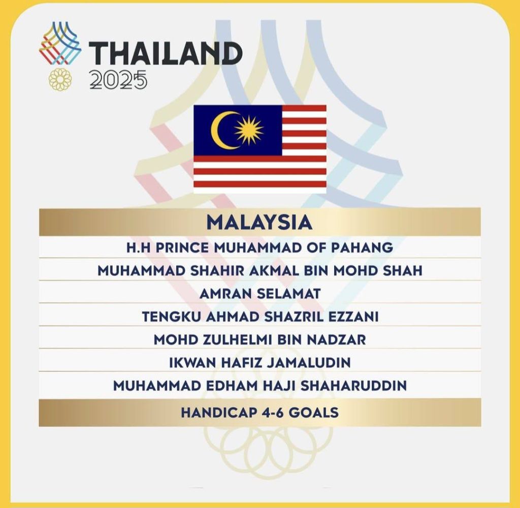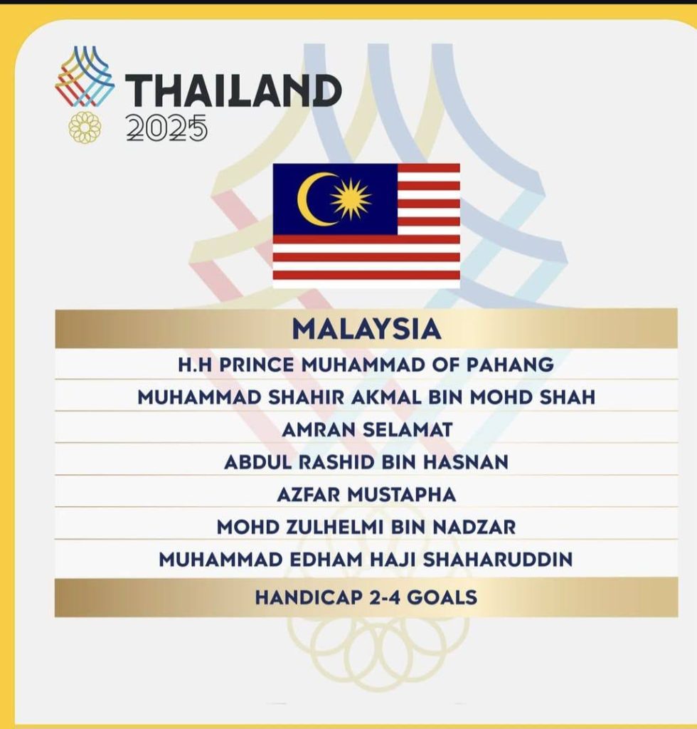 Skuad Polo kebangsaan turut dibarisi YAM Tengku Arif Bendahara Tengku Muhammad Iskandar Ri’ayatuddin Shah ibni Al-Sultan Abdullah Ri’ayatuddin Al-Mustafa Billah Shah yang turut beraksi dalam kedua-dua handicap (2-4 dan 4-6) sekaligus memperkukuh kekuatan jentera negara dalam usaha memburu emas di temasya kali ini. -KESULTANAN PAHANG