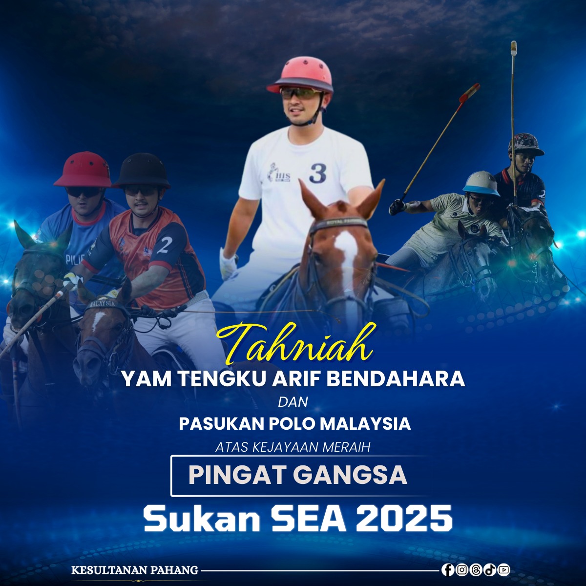 KUANTAN, 11 Disember 2025 – Dengan penuh rasa hormat dan bangga, warga Majlis Kesultanan Pahang (MKP) mengucapkan tahniah kepada YAM Tengku Arif Bendahara Tengku Muhammad Iskandar Ri’ayatuddin Shah Ibni Kebawah Duli Paduka Baginda Al-Sultan Abdullah Ri’ayatuddin Al-Mustafa Billah Shah serta seluruh skuad ekuestrian polo negara di atas kejayaan meraih pingat gangsa pada Sukan SEA 2025.