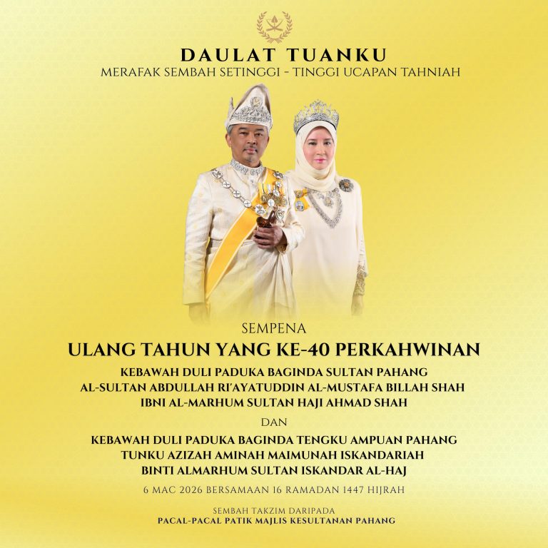 KUANTAN, 6 Mac 2026 – Patik sekalian warga Majlis Kesultanan Pahang dengan penuh takzim merafak sembah dan setinggi-tinggi ucapan tahniah sempena ulang tahun perkahwinan ke-40 Kebawah Duli Paduka Baginda Sultan Pahang, Al-Sultan Abdullah Ri’ayatuddin Al-Mustafa Billah Shah Ibni Al-Marhum Sultan Haji Ahmad Shah dan Kebawah Duli Paduka Baginda Tengku Ampuan Pahang, Tunku Azizah Aminah Maimunah Iskandariah Binti Almarhum Sultan Iskandar Al-Haj.