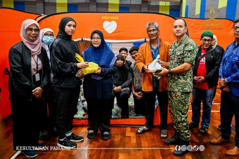 KUANTAN 19 Disember 2025- YAM Tengku Panglima Raja Brigedier Jeneral Tengku Amir Nasser Ibrahim Shah ibni Al-Sultan Abdullah Ri’ayatuddin Al-Mustafa Billah Shah menyantuni mangsa banjir di tiga buah Pusat Pemindahan Sementara (PPS) sekitar daerah di sini semalam.
